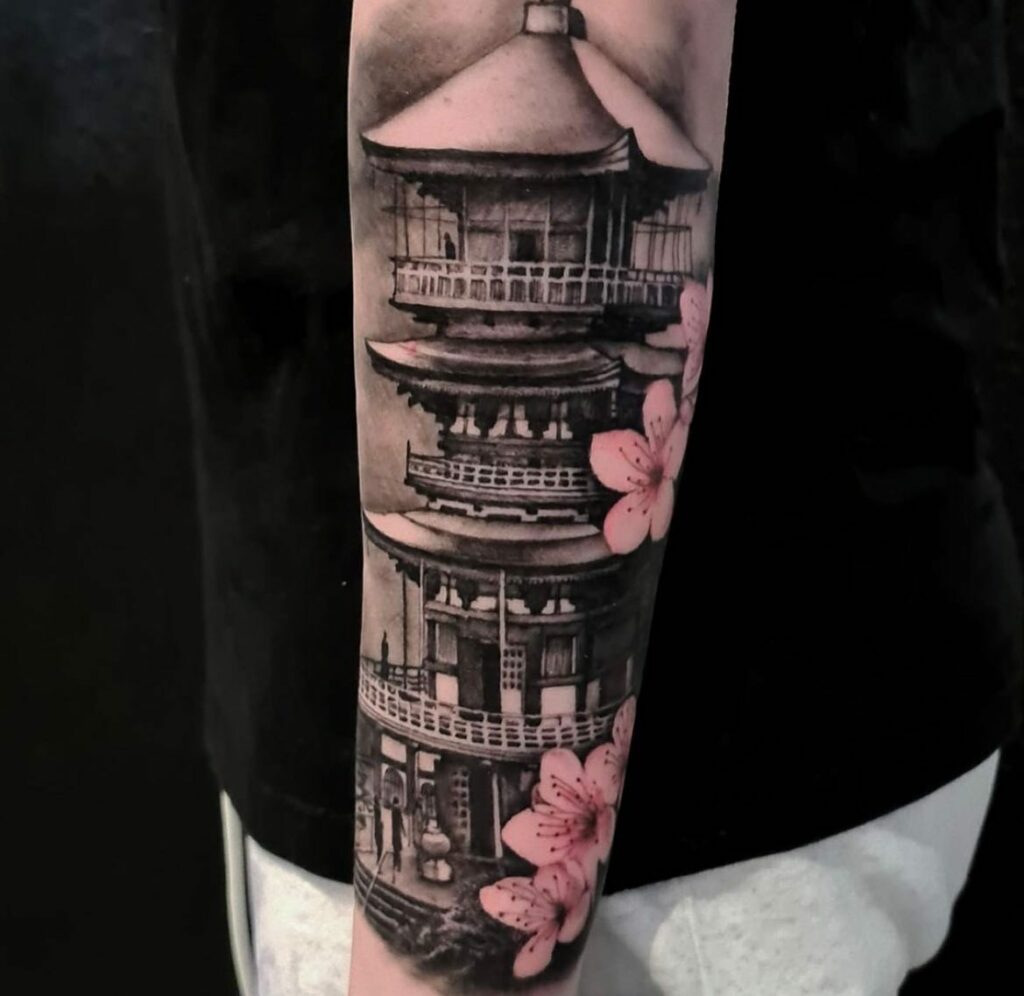 - Tattoo Ideas: ArtisticTattoo, asianInfluence, BlossomTattoo, cherryblossoms, CulturalTattoo, detaileddesign, ElegantTattoo, InkArt, inked, Monochromatic, pagoda, tattooart, traditionaltattoo